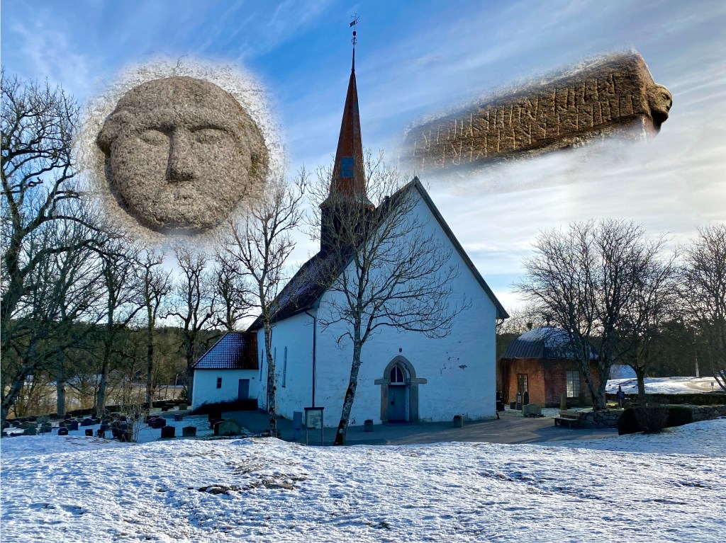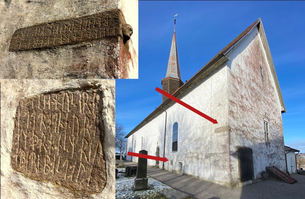 In the 14th century, when the church had stood for approx. 200 years, it was rebuilt and extended, adorned with small portraits and runic writings carved in stone. Both rune stones sit on the south wall, where the red arrows in the picture point.