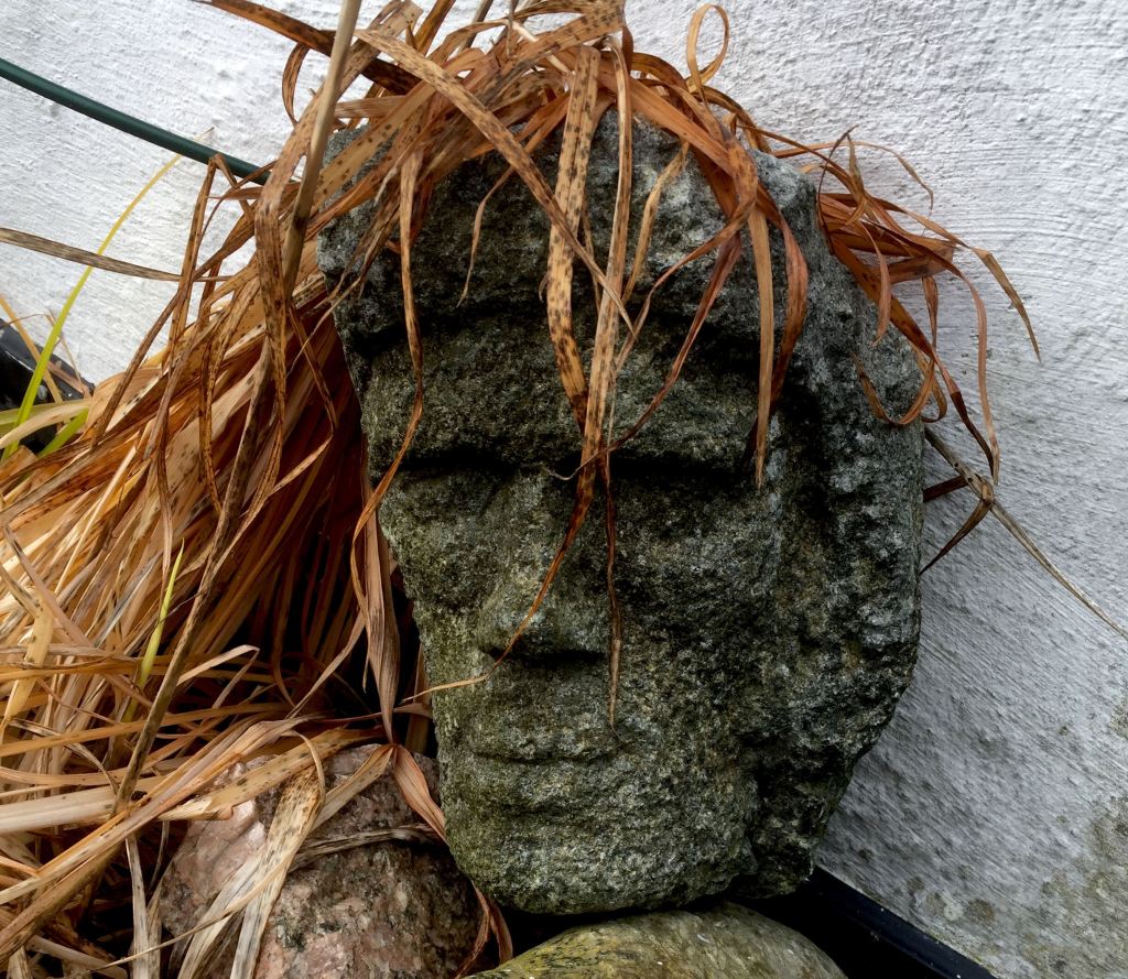 A stone head from my garden. Photo: Tom Thowsen 2020