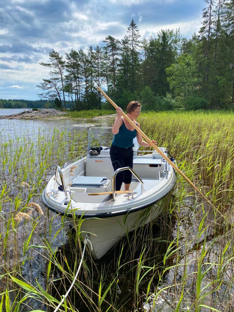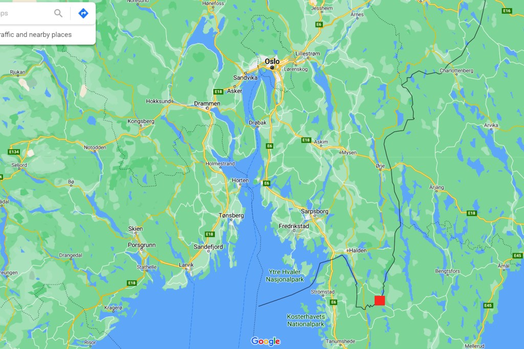 Lake Kornsjø marked with a red squareMy wife handles our boat near Hisøya island. Photo: Tom Thowsen 2020