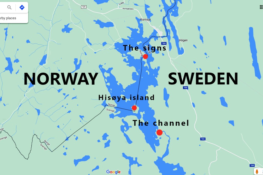 In some places, Sweden is exceptionally near, so close that we can toss stones at each other. The island to the left is Sweden. The pole in the foreground, and the cabin as well, is in Norway. Hey, you`re bound to break the law when travelling by boat. There are no markings on the waves.