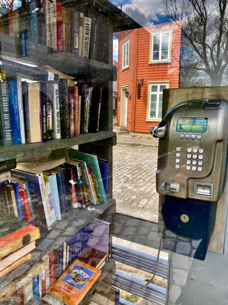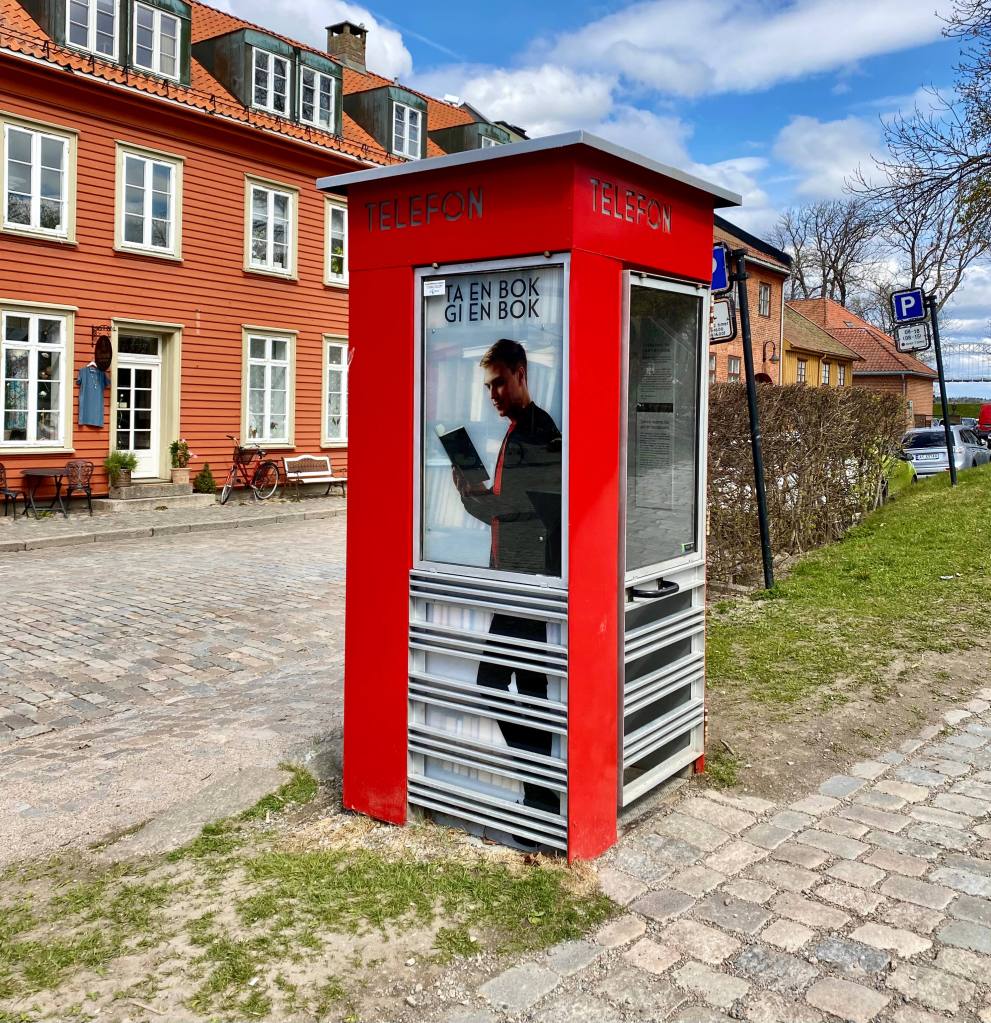 A reused telephone booth where people can change books – the sign says: take a book, give a book. Photo: Tom Thowsen
